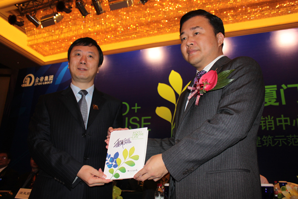李雄虎总裁向金帝集团建筑研究中心总经理郝少禹移交绿色建筑手册。