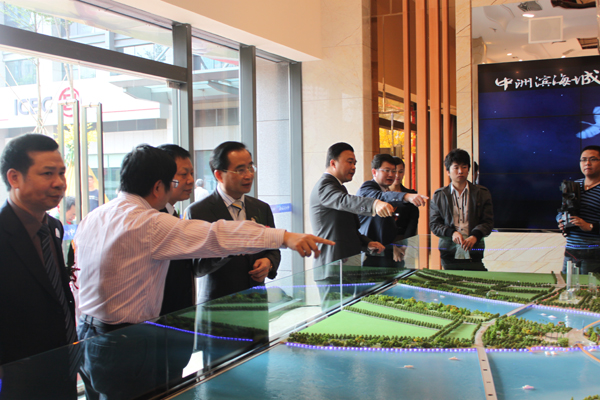 揭牌典礼后,来宾一行参观了金帝·中洲滨海的营销中心。中洲滨海城项目沙盘设于营销中心最醒目位置,该项目先进的规划理念与宏伟的造城气魄尽收眼底。中心的另一大亮点是以数字化的形式呈现项目特色,在项目沙盘的周边摆放着超大显示屏、触摸屏,生动形象地演示项目效果图、区位位置、周边配套、生态景观等,充分将金帝·中洲滨海城致力于以国家最高绿色建筑标准打造理想人居的先进理念展露无遗。