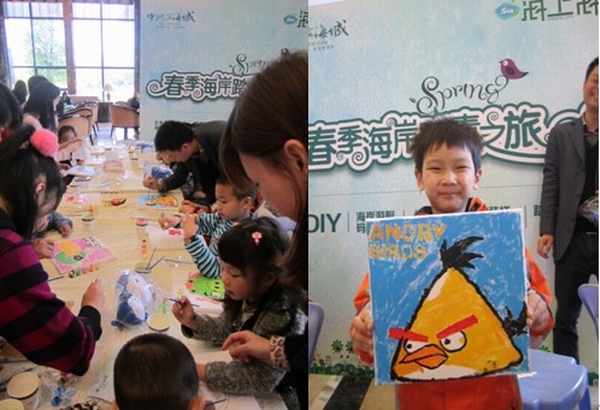 最吸引孩子们的,要属油画DIY和巧克力DIY了。工作人员早早备好的彩绘道具在一群小朋友手中化身“神笔”,专业老师指导后,一幅幅艺术作品成功出炉。其中一个小朋友把自己最喜欢的游戏主人翁“愤怒的小鸟”涂鸦得活灵活现,引得家长们一片叫好。也有一些年龄比较小的朋友,在家长的帮助下也能完成作品,浓浓的亲情流露在笔端。