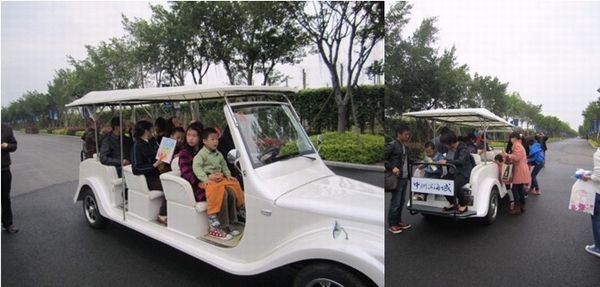 图片说明:大家一起坐上电瓶车,沿着美丽的林荫小道前往游艇码头
