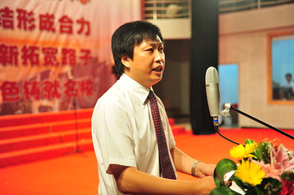 金帝集团总裁、学校董事会执行董事李雄虎先生代表学校董事会在典礼中发言,他从营造团结奋进、积极向上的校园文化的高度,对学校今后的发展作出了具体明确的指示。他指出,李德文董事长怀着“科教兴国”的使命感和责任感创办了泉州外国语中学,就是要以投资兴教的方式来回报社会。李雄虎总裁强调,泉外一方面要坚持以弘扬文化精神为左翼,以外语专长为右翼,倾力培养品学兼优的人才;另一方面,要大力弘扬“有教无类”、“因材施教”的儒家教育思想精华,把“和”文化作为泉外教育管理理念的核心,全力打造校园“和”文化,为社会培养更多的栋梁之材。