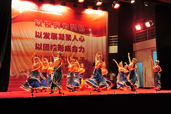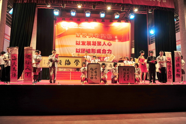 典礼最后,来宾与师生观看了由校艺术团精心准备的文艺汇报演出。饱含深情的大合唱、振奋人心的民族舞蹈、悠扬古朴的笛子与书法表演、声情并茂的配乐朗诵、刚劲有力的武术表演、洒脱不羁的街舞……整台演出高潮迭起,掌声不断。演出结束后,李德文董事长、李雄虎总裁上台与演员们分别握手,合影留念,开学典礼在热烈欢快的气氛中顺利落幕。