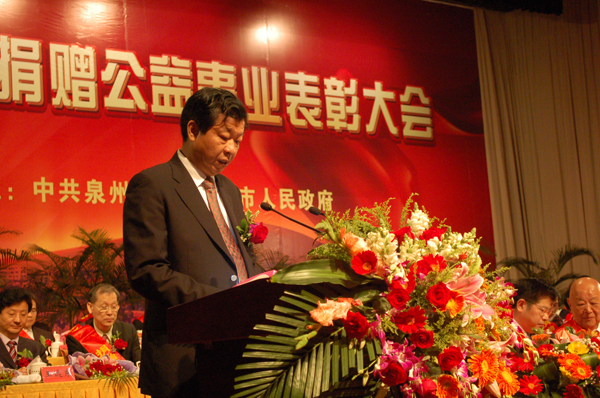 表彰大会由市委朱淑芳副书记主持。会上,首先由黄少萍代市长作了侨捐工作报告,陈荣洲副市长宣读市政府表彰文件;随后陈永栽先生、林树哲先生分别代表海外华侨和港澳同胞发言。最后,徐钢书记发表讲话,他充分肯定了社会各界为泉州公益事业作出的突出贡献,号召全社会以表彰获得者为榜样,怀仁爱之心,施慈善之举,为构建社会主义和谐社会作出贡献。