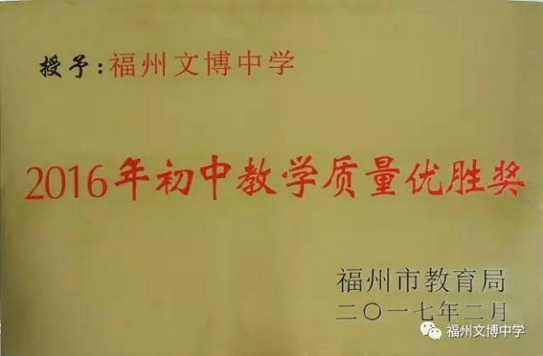福州文博中学被福州市教育局授予 “2016年初中教学质量优胜奖”