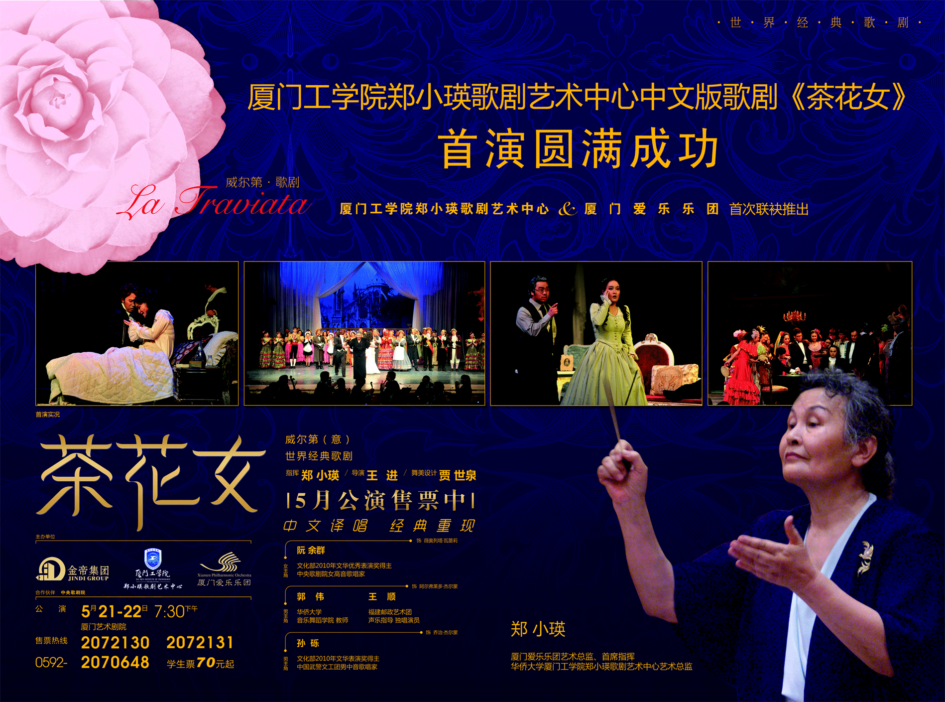 歌剧《茶花女》不仅是在中国上演的第一部、同时也是最受国人喜欢的西洋歌剧,而在中国推广歌剧,一直是郑小瑛老师多年的梦想,这个理想得到了金帝集团及厦门工学院董事长李德文先生和王进导演的热烈支持——于是,2010年6月29日,厦门工学院“郑小瑛歌剧艺术中心”宣布正式成立,第一部作品即是这部中文版《茶花女》。